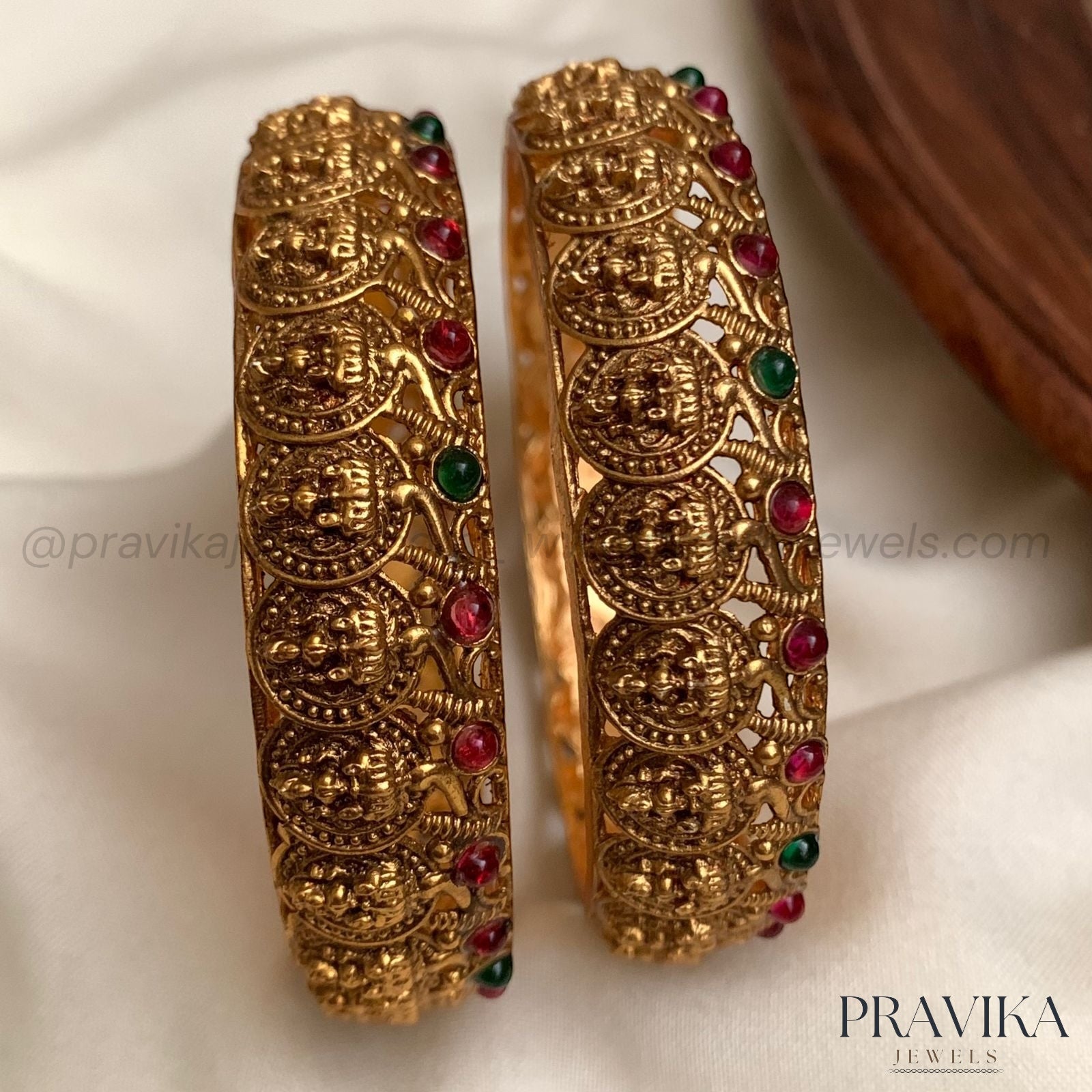 These bangles feature detailed circular coin engravings inspired by traditional South Indian heritage jewellery. The alternating ruby and emerald stones add a regal contrast, making them a timeless choice for weddings and festive wear.