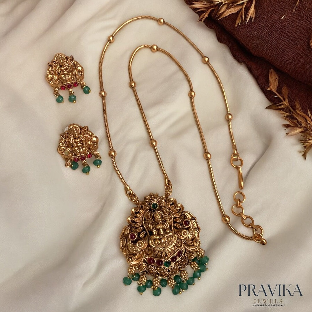 This elegant Lakshmi chain pendant set features a detailed Goddess Lakshmi pendant seated on a lotus, surrounded by intricate temple motifs and vibrant ruby-emerald accents. The beaded chain adds a graceful touch, while the green bead drops enhance its festive appeal. Comes with matching Lakshmi earrings for a complete traditional look.