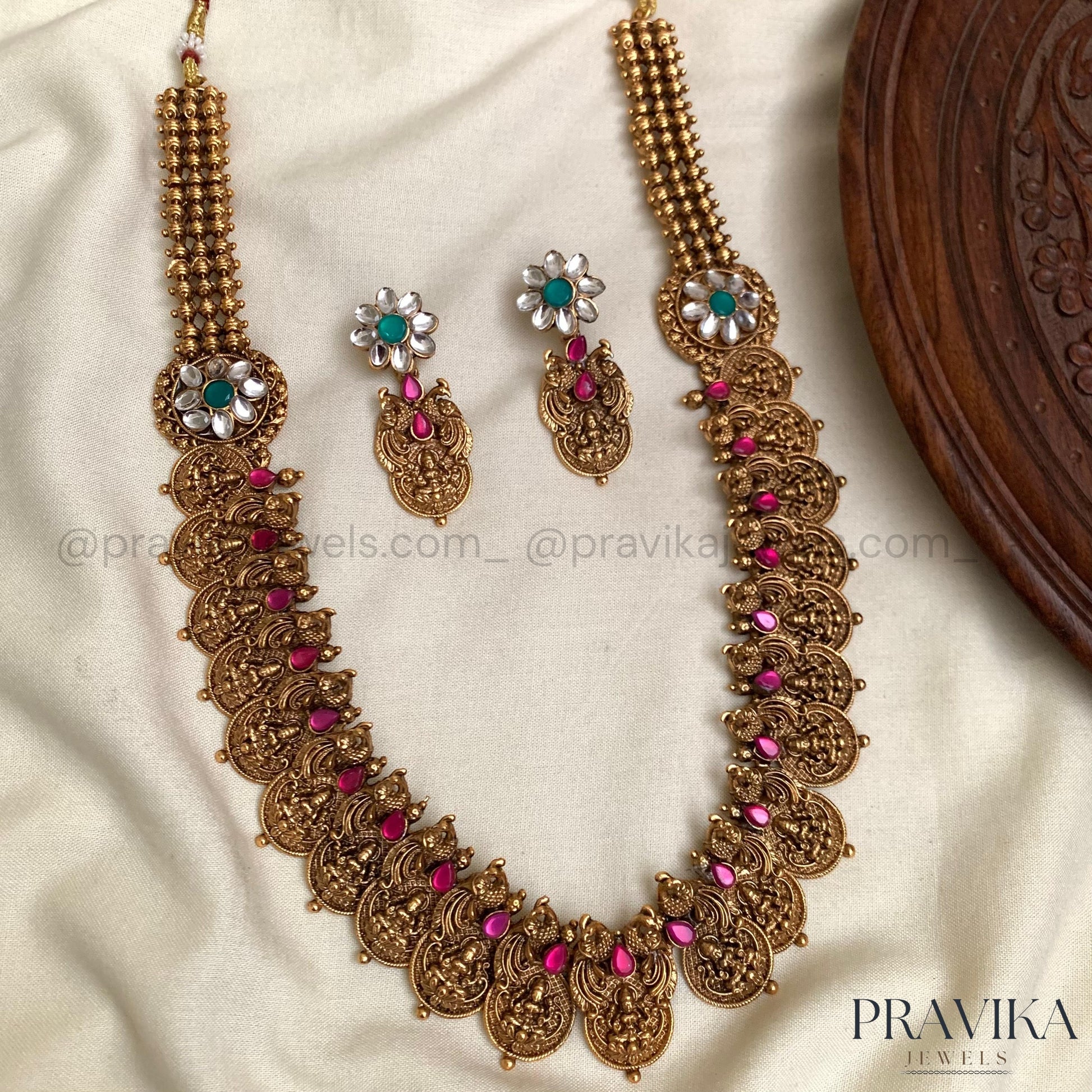 A regal long haram handcrafted in antique gold finish with peacock motifs, ruby drops, and kundan floral tops. Perfect for weddings and festive elegance.