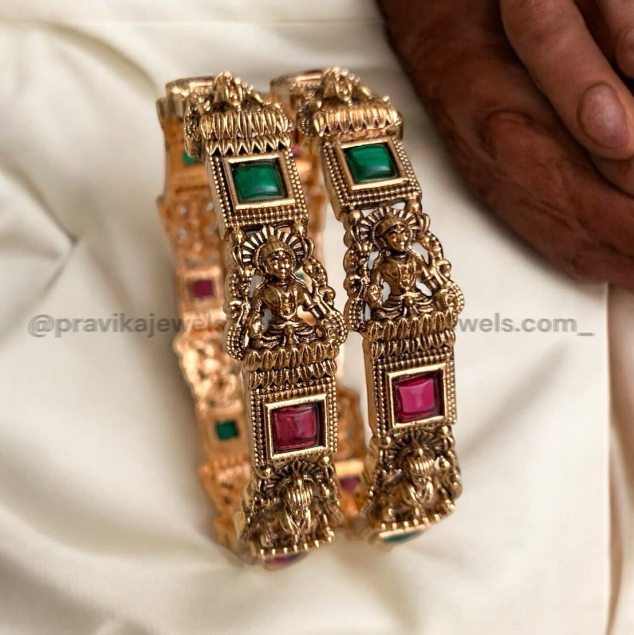 Unveil the heritage charm with our Set of 2 Antique Temple Bangles, beautifully crafted with goddess Lakshmi motifs and premium square-cut stones. Available in Ruby, Emerald Green, Pearl White, and Ruby-Green Dual Tone, these bangles bring timeless grace to every celebration.