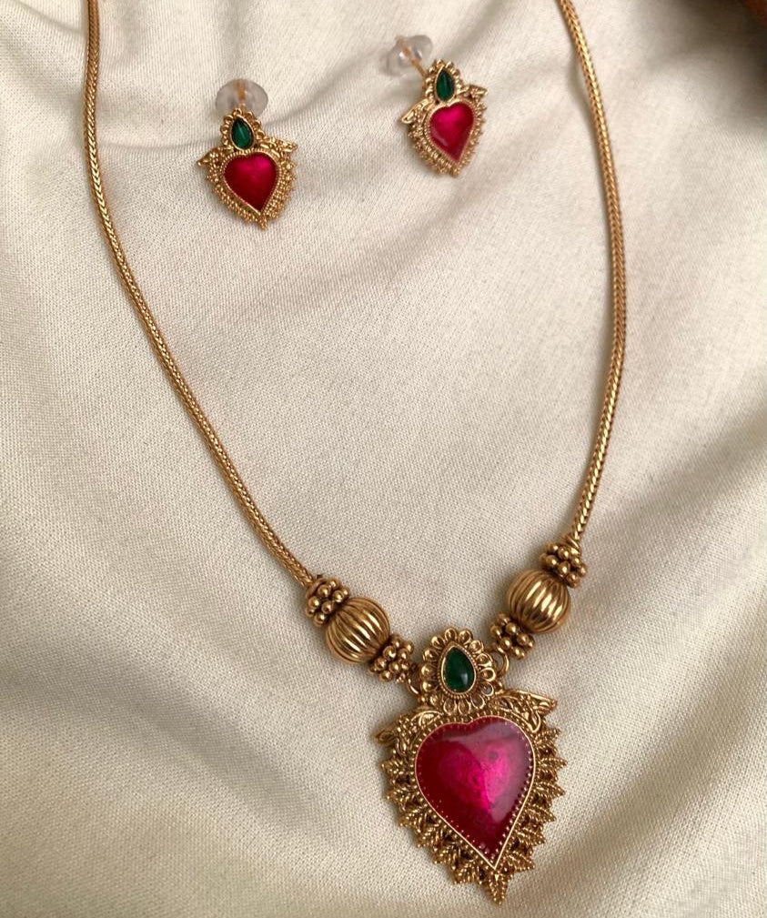 This graceful necklace set features a heart-shaped pendant embellished with vibrant stones in green, ruby, and red color options. Designed with antique gold detailing and paired with matching earrings, it adds a perfect blend of charm and tradition for weddings, festive wear, or cultural occasions.