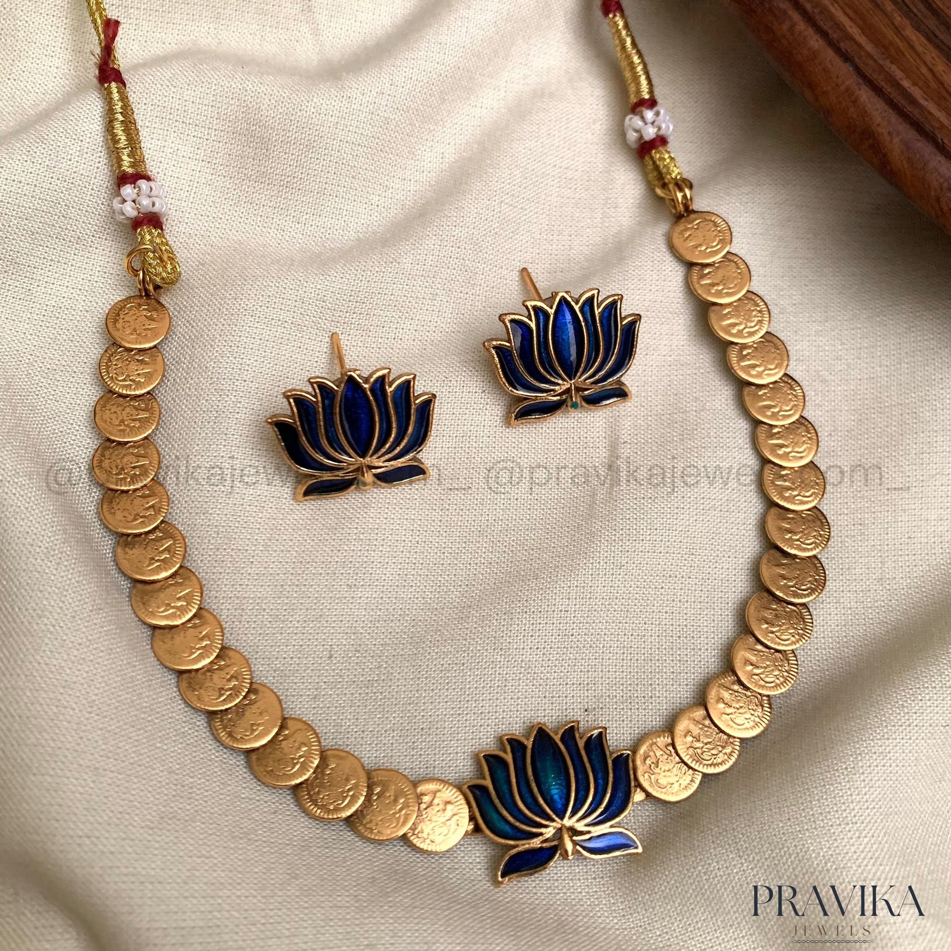 A stunning blend of tradition and elegance โ this necklace features antique coin motifs beautifully paired with a green lotus centerpiece. The matching lotus earrings add a graceful touch, making this set a timeless choice for festive occasions, weddings, and cultural celebrations.