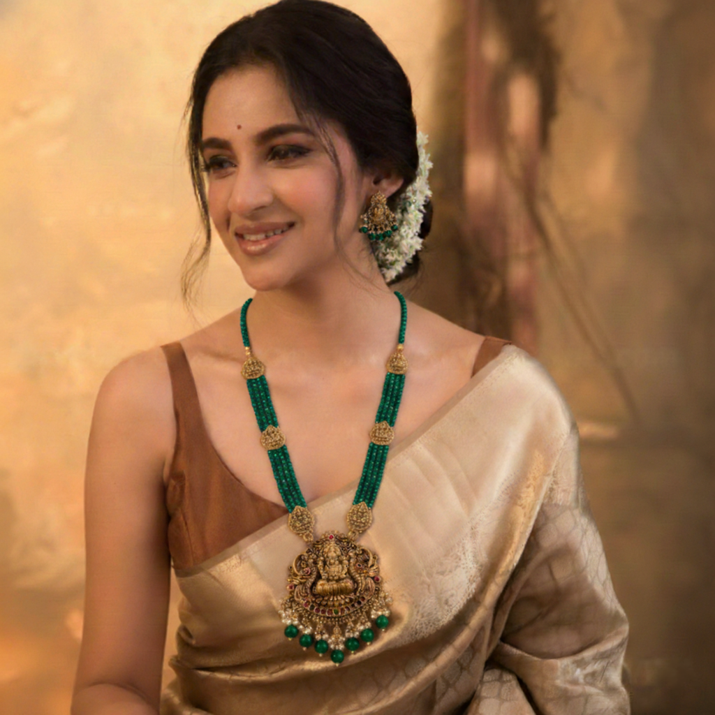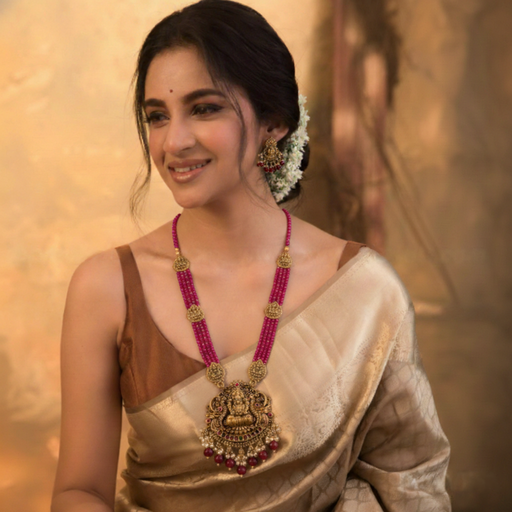 A stunning temple-style long haram featuring an intricately crafted Goddess Lakshmi pendant, paired with elegant multi-strand beads and matching earrings. Designed to bring a rich traditional charm, this piece is perfect for weddings, festive occasions, and classic silk saree looks. A timeless design that adds grace and divinity to every outfit.