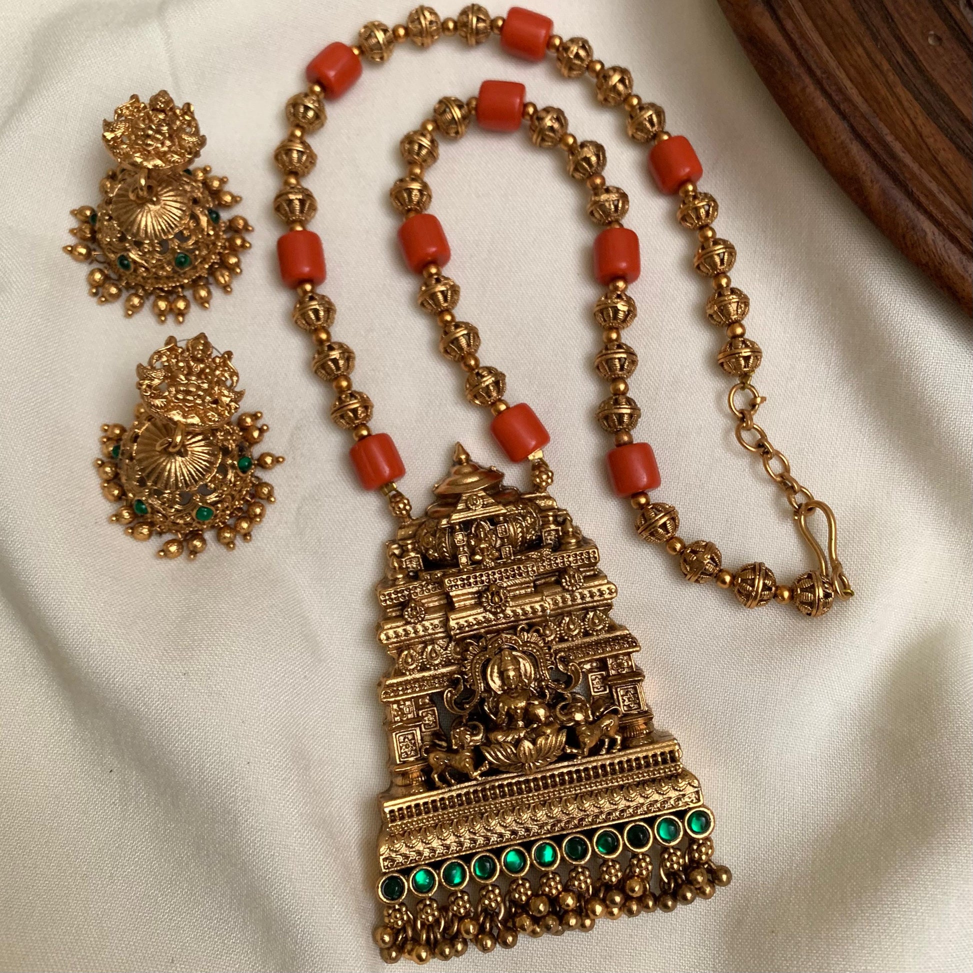 A traditional temple-style long necklace set featuring a richly detailed gopuram-inspired pendant with a deity motif and classic bead detailing. Accented with colored cylindrical beads, this design reflects timeless South Indian craftsmanship, ideal for weddings and festive occasions.
