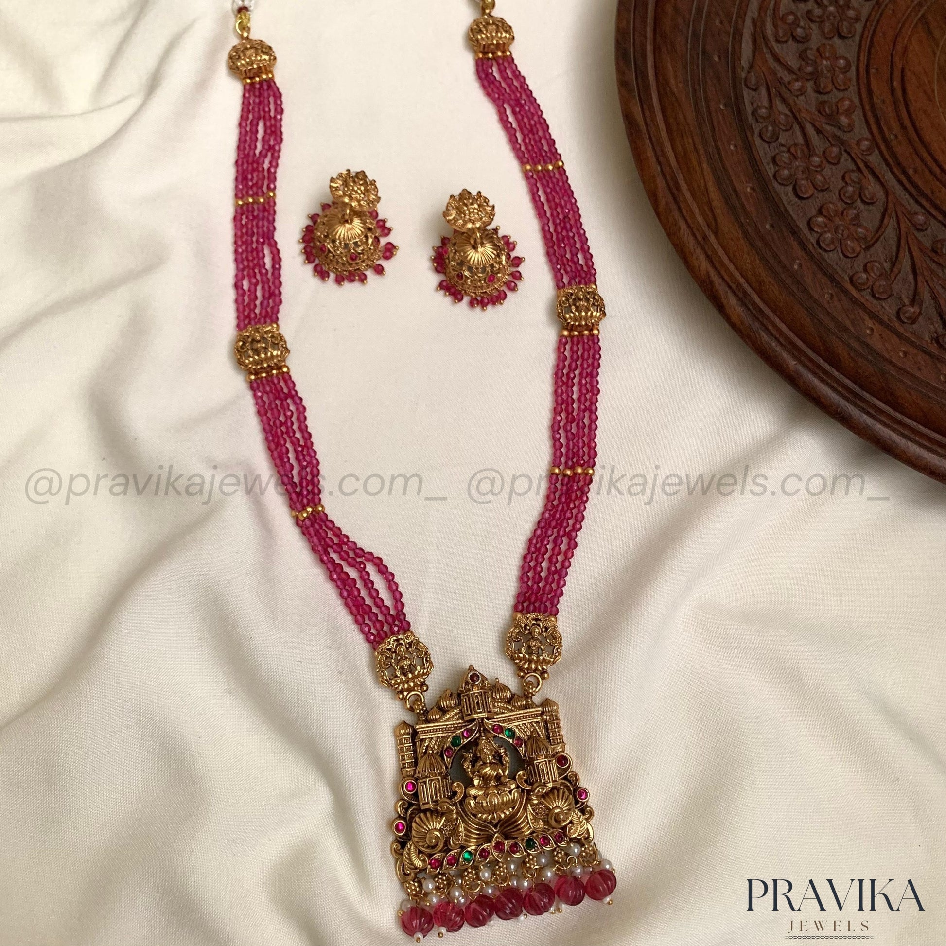 This traditional long haram is inspired by classic South Indian temple jewellery. The highlight of the piece is the intricately crafted Goddess Lakshmi pendant, framed with temple-style architectural elements and detailed carvings. The pendant is adorned with ruby and green stone accents and finished with pearl and pink bead drops.